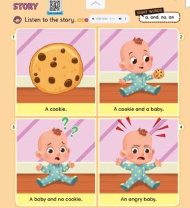 1. გაკვეთილზე განსაკუთრებული ყურადღება ექცევა სასაუბრო ინგლისურს და მოსმენის უნარის განვითარებას, თითოეული გაკვეთილი მოიცავს უამრავ მოსასმენ  და სასაუბრო მასალას. საბავშვო სიმღერების, როლური თამაშების,დიალოგებისა და  სახალისო ტექსტების დახმარებით მოსწავლეები იწყებენ ფიქრსა და საუბარს ინგლისურ ენაზე.